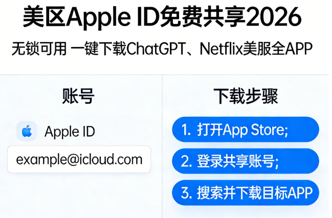美区Apple ID共享|免费无锁、即登即下,解锁2026美服全品类热门应用!无需美国本土手机号、地址,不用复杂注册,无需绑定支付信息,登录下方共享美区Apple ID,即可在App Store一键下载美服独有AI工具、社交软件、爆款游戏、跨境电商、影视APP,账号每日人工维护、实时排查失效问题,安全可用、新手零门槛上手,轻松解锁美区iOS生态全部资源。(适配iOS 16及以上所有设备,老旧系统可尝试账号2,若无法下载请升级系统后再试)