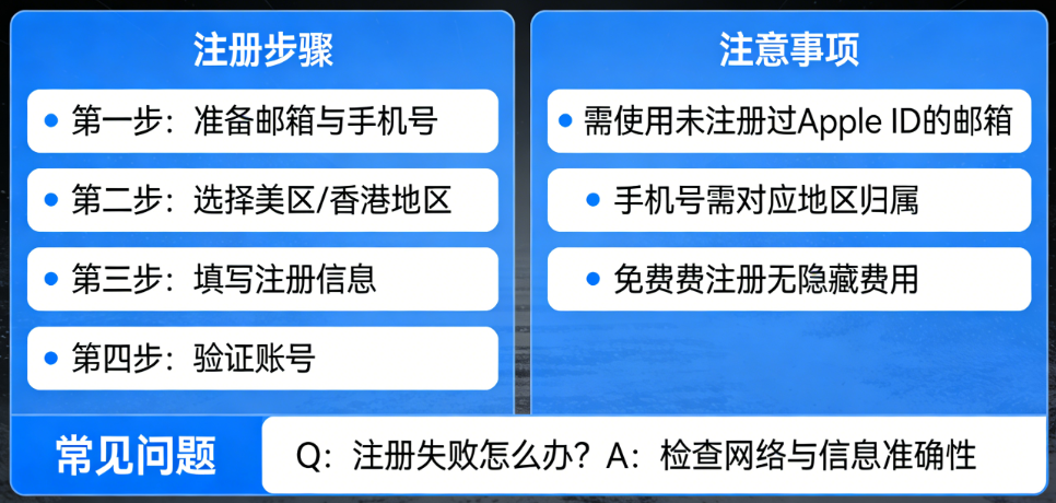 - 1. 邮箱不是全新的:只要该邮箱注册过Apple ID(哪怕是国区),再用来注册美区/香港ID,一定会失败,这是新手最常踩的坑;