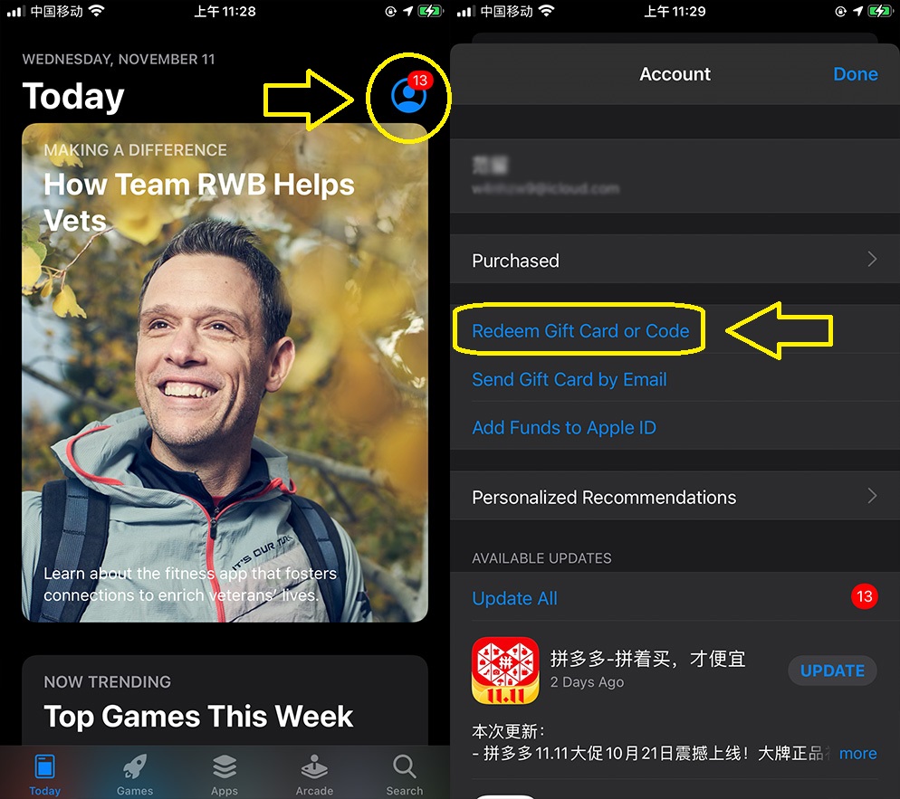 首先打开App Store,登录上美区苹果ID,然后点击“人像图标”,进入Account之后,选择“Redeem Gift Card or Code”。