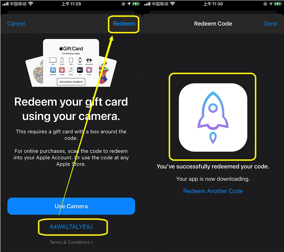 然后在最下面的“Enter Code Manually”里面输入准备好了的兑换码,不要把空格输入进去了。输入之后点击“Redeem”,然后就会出现Shadowrocket兑换成功的界面。然后它自动会下载到自己的手机桌面上!