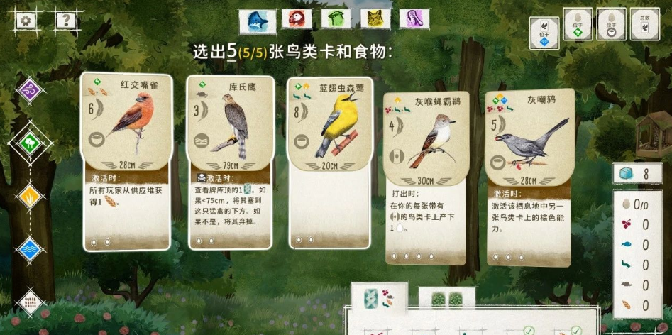 - 抽取鸟类卡牌:从牌库或公共区选择新鸟类,并制定最优的生态布局策略。