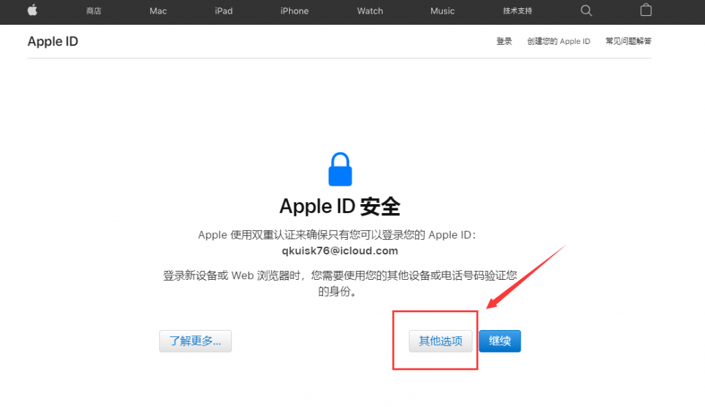 3、当提示“Apple ID安全”的时候,在下面选项中选择“其他选项”。
