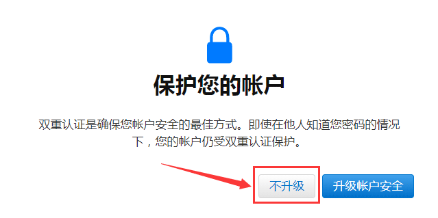 4、跳出“保护您的账户”后,选择“不升级”。