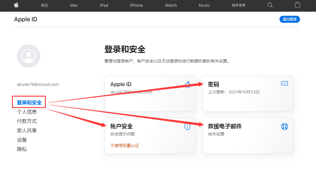 5、进入Apple ID管理中心后,先选中左边的「登录和安全」,然后按照下图,依次修改「密码」,「账户安全——更改安全提示问答」,在「救援电子邮箱」里绑定密保邮箱就行。